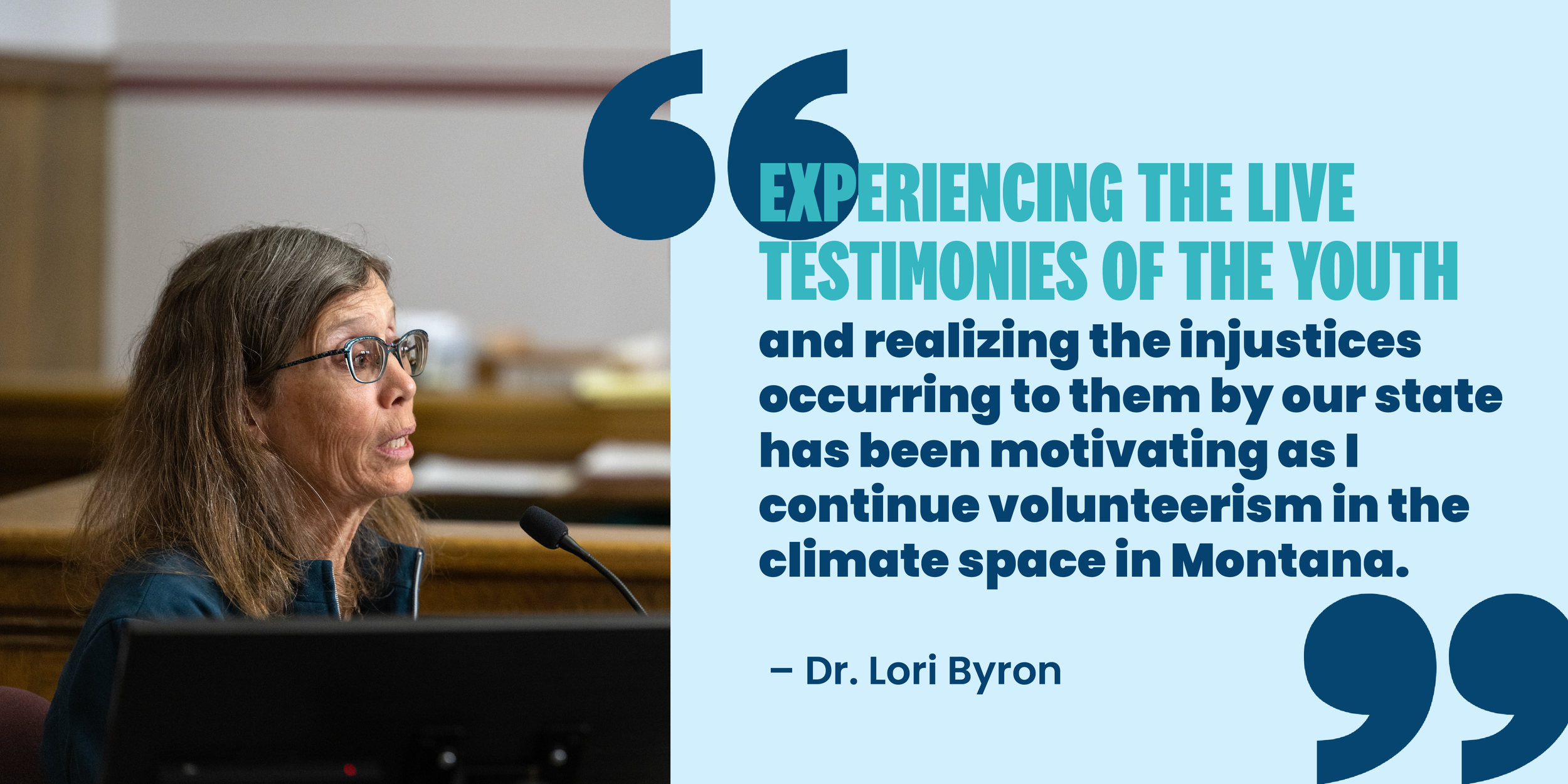 “Participating in the Held v. Montana trial (along with my husband Rob, who was also an expert) and being able to support the youth plaintiffs was one of the greatest honors of my life. Experiencing the live testimonies of the youth and realizing the injustices occurring to them by our state has been motivating as I continue volunteerism in the climate space in Montana. The District Court ruling, which was subsequently upheld by Montana's Supreme Court, was likely the greatest climate victory in Montana this millennium.” - Dr. Lori Byron