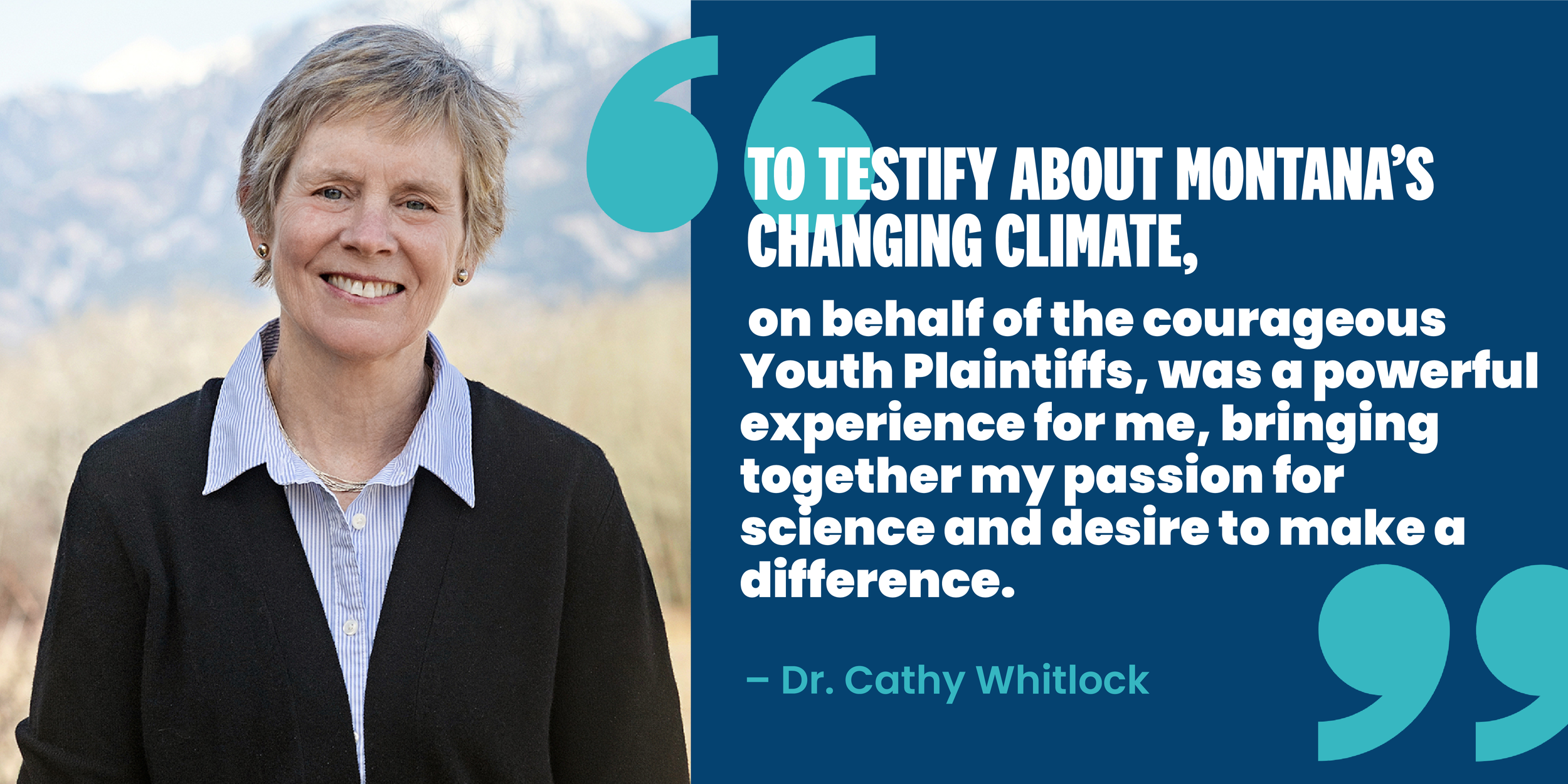“Throughout my career as an Earth scientist, research has been a door to discovery, adventure, and sheer fun. Over the years, however, I’ve come to realize that doing science for its own sake is not sufficient; my knowledge also gives me the credentials to educate, influence, and guide societal choices. So, to testify about Montana’s changing climate, on behalf of the courageous youth plaintiffs, was a powerful experience for me, bringing together my passion for science and desire to make a difference.” - Dr. Cathy Whitlock