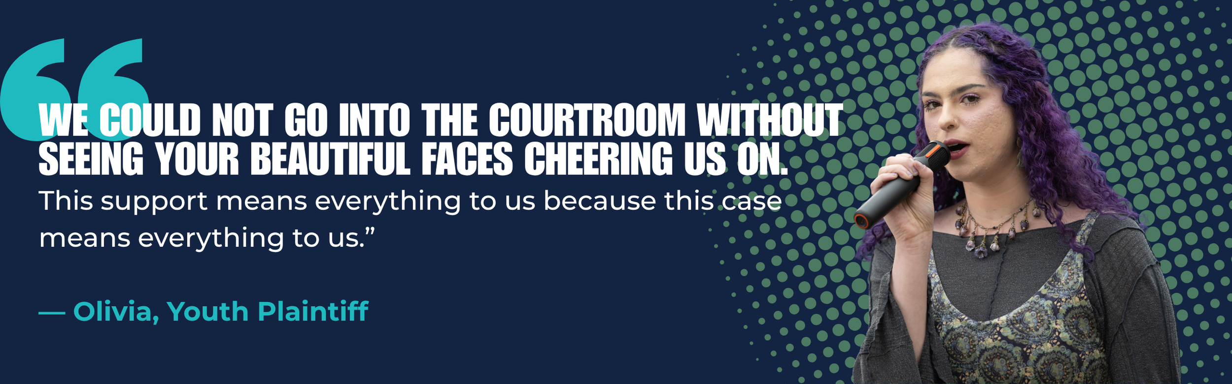 Over a hundred supporters gathered to cheer on the youth plaintiffs, holding signs and chanting as the youth entered the courthouse. Supporters packed the courthouse and tuned in to the hearing at a nearby watch party.